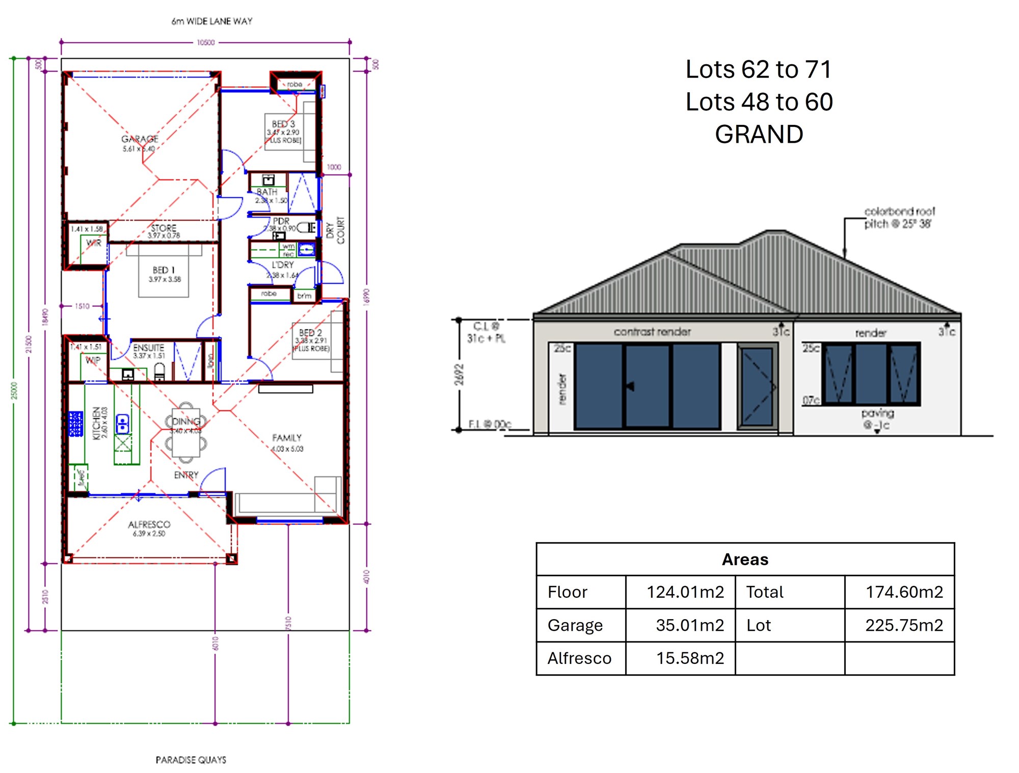 The Fairway is a smartly Planned 3 bedroom, 2 bathroom home designed for rear-loaded lots, with laneway garage access and a front entry reached through a Landscaped area facing out toward Paradise Quays.